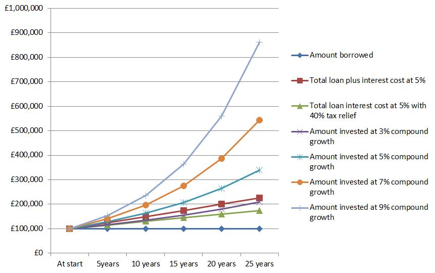 Interestingly, even where the loan interest and the return achieved are similar (as shown by the 5% less tax relief and 3% growth lines) the investment return still outstrips the loan interest cost over time. This is because of the compounding effect of the investment, whereby interest is earned on interest.